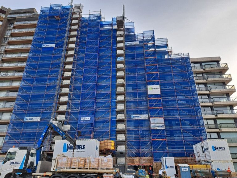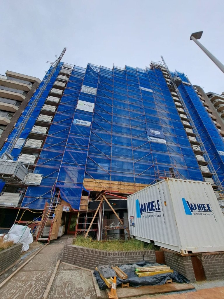 Een project van de gevelrenovatie die kan samengevat worden als 3 voorgevels, 3 achtergevels, 6 technische verdiepingen en een hoofddak. Onze voornaamste focus ligt momenteel op het aangieten van de nieuwe randbalken op de technische verdiepingen en het vernieuwen van de betonneuzen van de terrassen. Dit is noodzakelijk voor het kunnen plaatsen van de balustrades.
